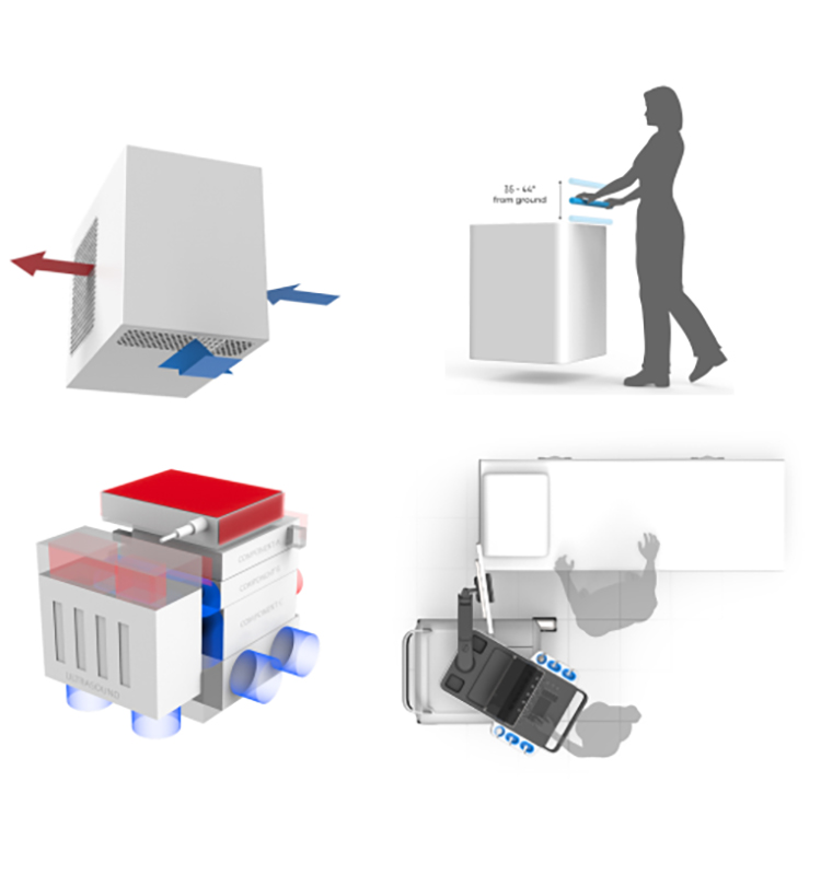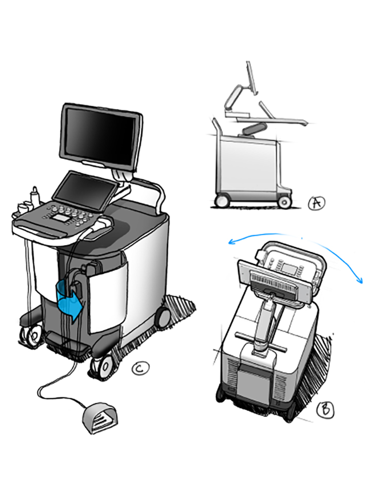 Although Seno’s component technology was established, the arrangement of each part in the cart was up to Tactile’s strategy for space optimization, thermals, accessibility, wire routing, and weight distribution. Usability recommendations included cable management ideas, height guidelines for console use, monitor range of motion, clinic room scenarios, and cart mobility.